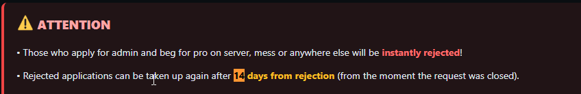 Server Nickname: ϟ Unforgettable シ Age: 20 Contact (Discord, Steam, etc.): Discord: not_rasta // Steam: https://steamcommunity.com/id/TotallyNotHim/ Hours played on the server (GameTracker link): https://www.gametracker.rs/player/188.212.100.247:27015/%CF%9F%2BUnforgettable%2B%E3%82%B7/ = 34h Do you have experience in knife mode: Ofc, I've been playing for years and I have experience as an admin, it's not my first time and I'm glad to be back to play actively. Reason for wanting admin: To help the players when they need something and to ban cheaters first of all and to be a united community first of all and that there is no insults and to gag toxic players, ofc. Admin Type (day, night, school, etc): I'm free for now, I can be on the server day and night. Promotion Methods: Instagram, FB, Discord.. Have you read the rules?: Absolutely!